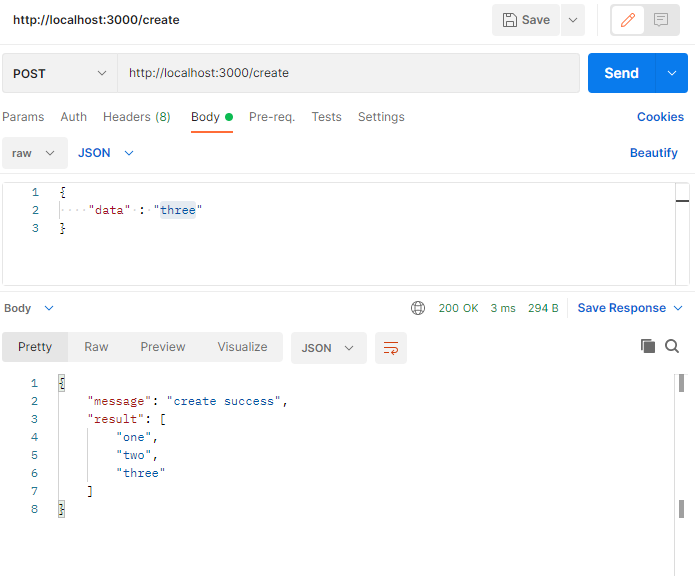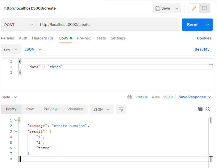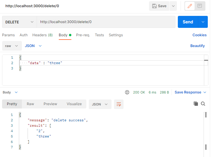 위에서 다룬 POST와 비슷하게 "delete/[배열 인덱스]" 형식으로 DELETE method를 보내면 특정 데이터를 삭제할 수 있다.